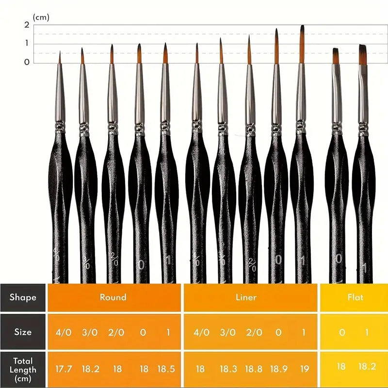 The set includes 12 brushes with various sizes and shapes: liners (0, 1, 2/0, 3/0, 4/0), rounds (0, 1, 2/0, 3/0, 4/0), and flats (0, 1). This variety allows for detailed work on projects like paint-by-numbers, miniature figures, and other crafts. The brushes come in a well-organized package, making it easy to select the right tool for each task.